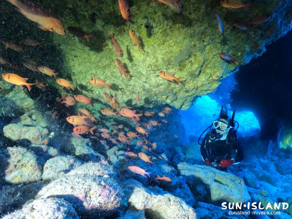 辺りを照らすと、アカマツカサやミナミハタンポの姿が見られ、出口付近では、背景の黒と穴の青のコントラストがキレイに映える造形がとっても神秘的。