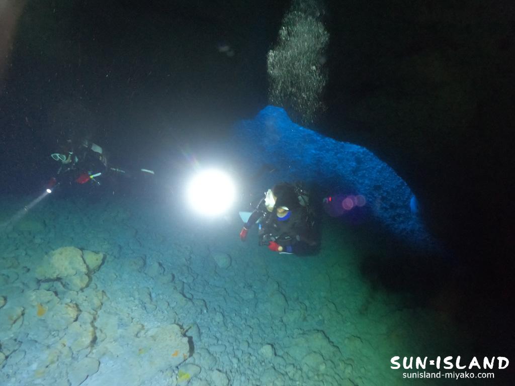 ダイビングポイント『通り池』に次ぐ横幅が広い洞窟をライトの明かりを頼りに進んできます。