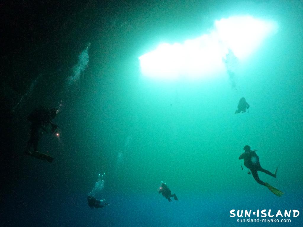 横幅30m x 縦幅20mほど非常に大きな穴からの侵入は、まるで商店街等にあるアーケドのような印象。池の中から外側を見ると青と黒の陰影がとてもキレイだ。