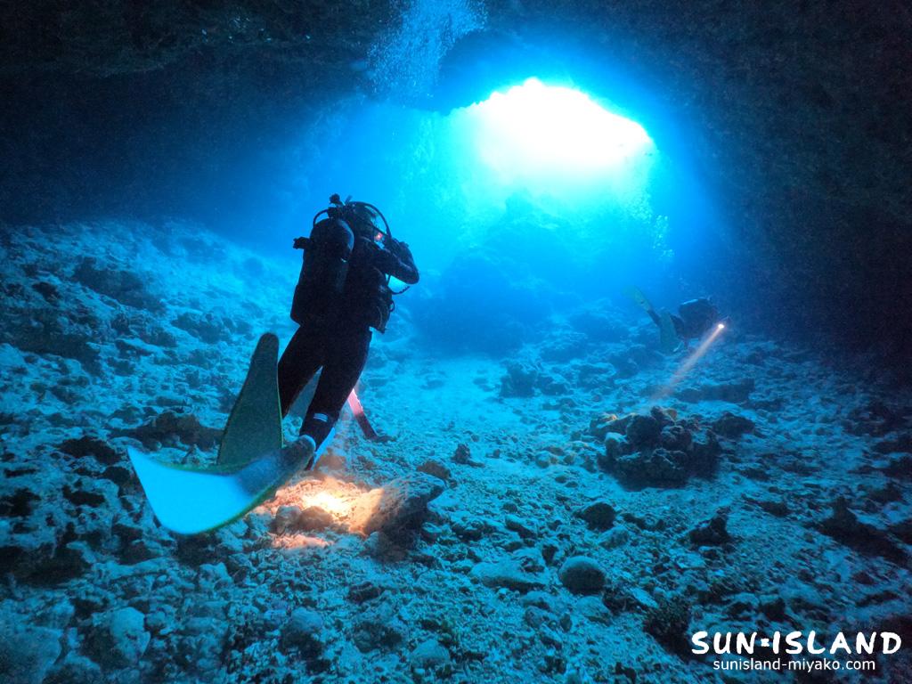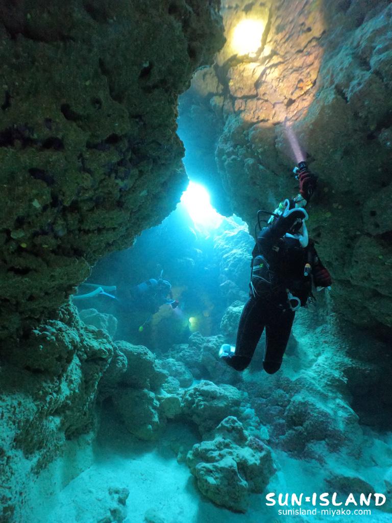 このポイント、所々天井に対し割れ目があり、晴れている日に潜ると、光が洞窟内にレーザー光線のように降り注ぎます。