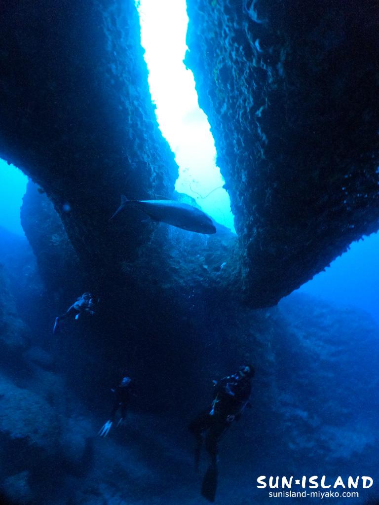 見ようによって十字にに見えなくもない穴の造形もさることながら、やはりワタシが一番オススメしたいのがホール内景色。陰影が誇張され素晴らしい景色なんだよね。伊良部島周辺のポインの中では個人的に一押です。