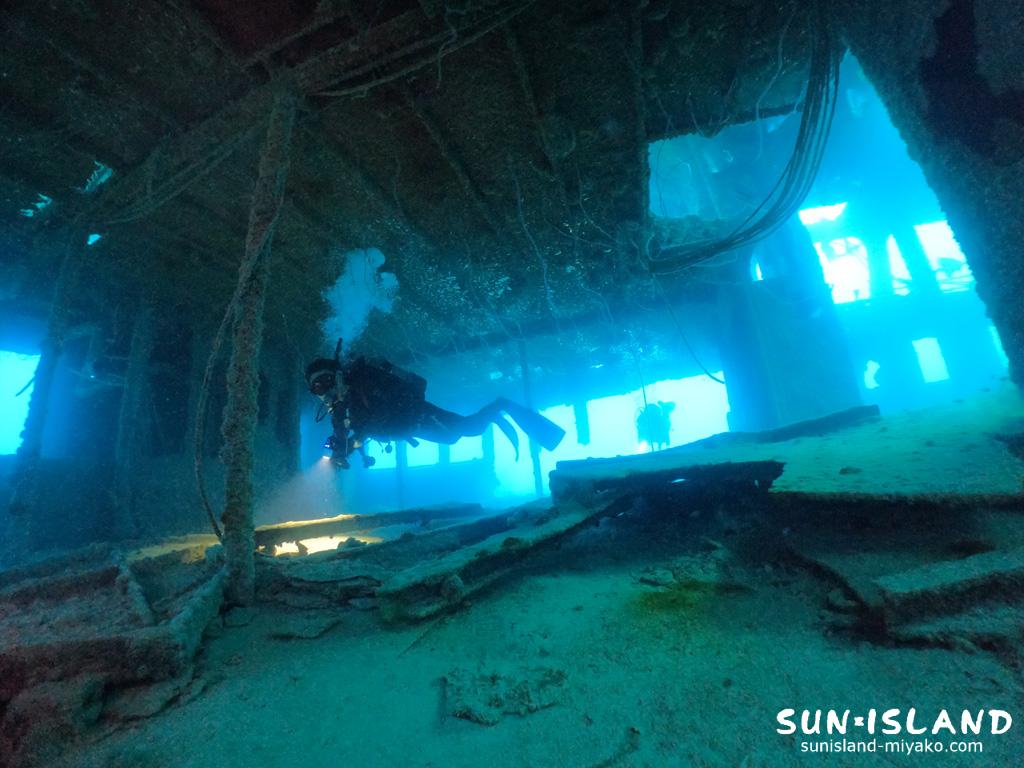 漁礁目的として伊良部島と宮古島を往来していたカーフェリーを沈めたのがこのポイントなんです。間口が広く、レジャーダイバーが容易に船内散策ができリピーターのゲストさんから人気があるんですよー。透視度が10m前後のことが一般的なのですが、本日は透視度25mほどあり沈船の外観がクッキリ見渡せました!