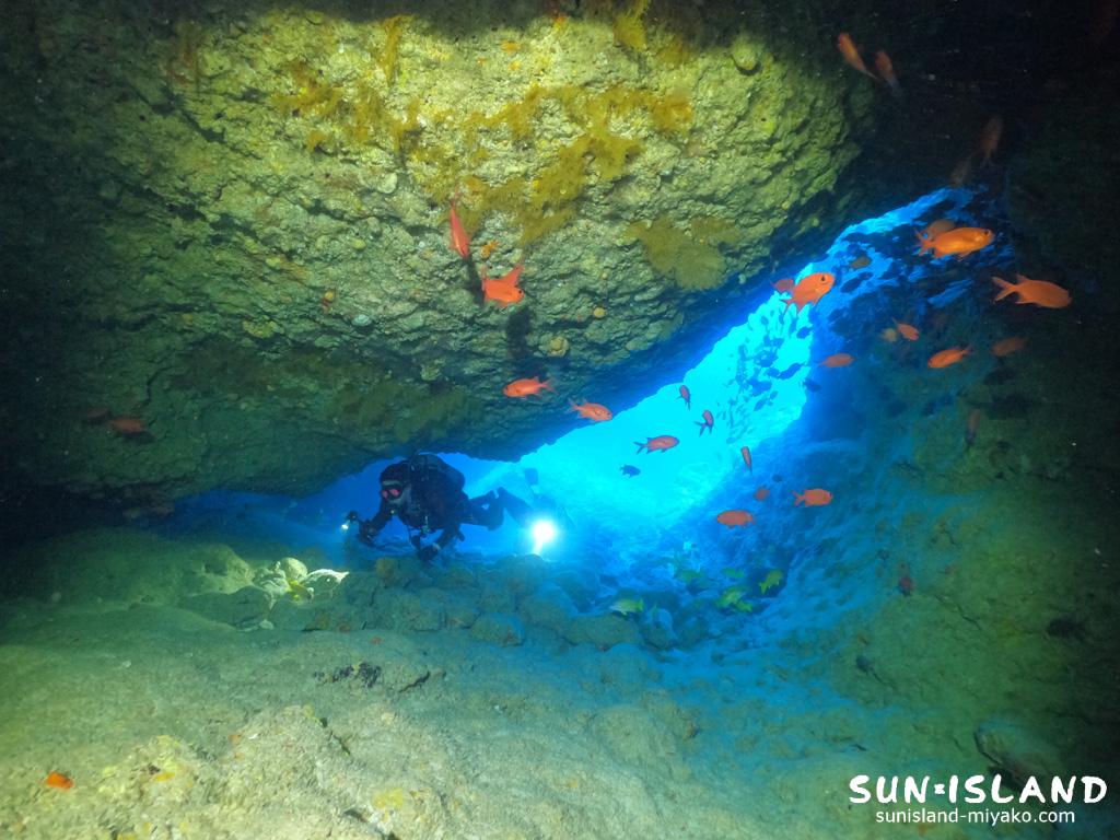 手狭で且つ長い洞窟内には、目玉がギョロッとし真っ赤なまるでキンメダイのようなアカマツカサたちがたくさん根付いており、ライトの光に一気に反応し辺りを泳ぎ回る姿が印象的でした。