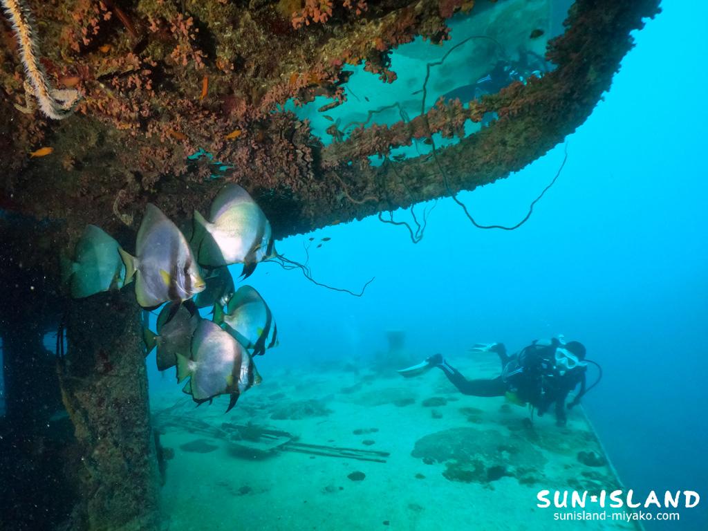 全長30mほどのカーフェリーを漁礁目的で沈めたこのダイビングスポット・ポイント。なかなかレジャーダイビングで沈船内部に侵入することってほぼないのですが、ここの沈船は内部侵入します。大きなジャングルジムのような船内を出たり入ったり繰り返しながら泳いでると、普段なかなか見る機会が少ないアカククリが群れている。近づいても逃げないので、写真撮影はし易いですよー。