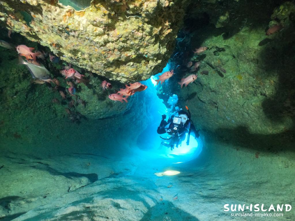 穴の大きさや形状、そしてアカマツカサ・ハタンポの群れが光の差し込み越しにシルエットになり、ほんとキレイなんだ。横幅1~2mほどの洞窟となるので、あくまでも2・3名のゲストさん少人数でのご案内となります。
