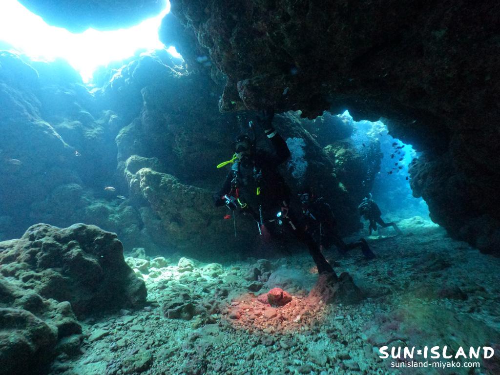 このダイビングスポット・ポイントはお昼前後に潜るのがおすすめ。なぜかというと、穴の形状や日差しが入る角度的にその時間に洞窟内に差し込む日差しが一番強くまるで光の回廊を探検してるかのような錯覚すら覚えるからだ。晴れてる日には皆さんにご紹介したいダイビングスポット・ポイントの一つ。ぜひリクエストしてくださいね。