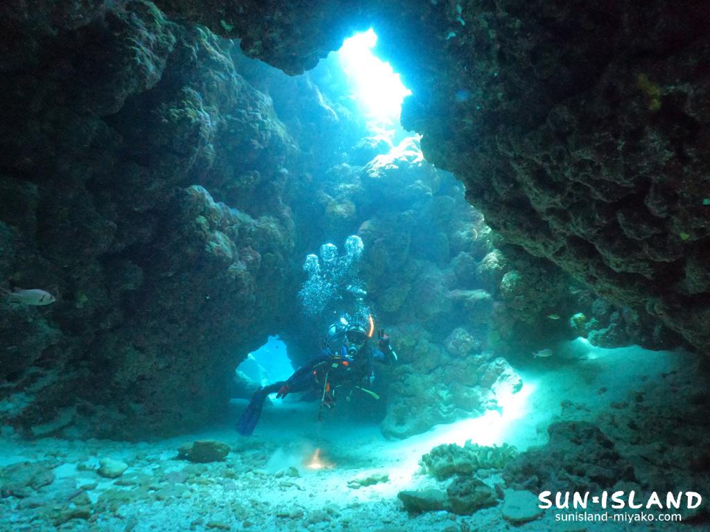 さて、GWが終わってもありがたいことにゲスト様からご予約をいただいており、日々海へでかけております。昨日から夏先取りと思えるような青空とギラギラ太陽がお目見え。若干北風が強いのが気になりましたが、水中はまずまずのコンディション。こんな時こそ潜りたいのがダイビングスポット・ポイントの見どころが水深10m前後の浅瀬にあり、洞窟内にダイレクトに光が差し込み、陰影がめちゃくちゃ際立ち穴の造形も合わせた景色が素晴らしいところ。