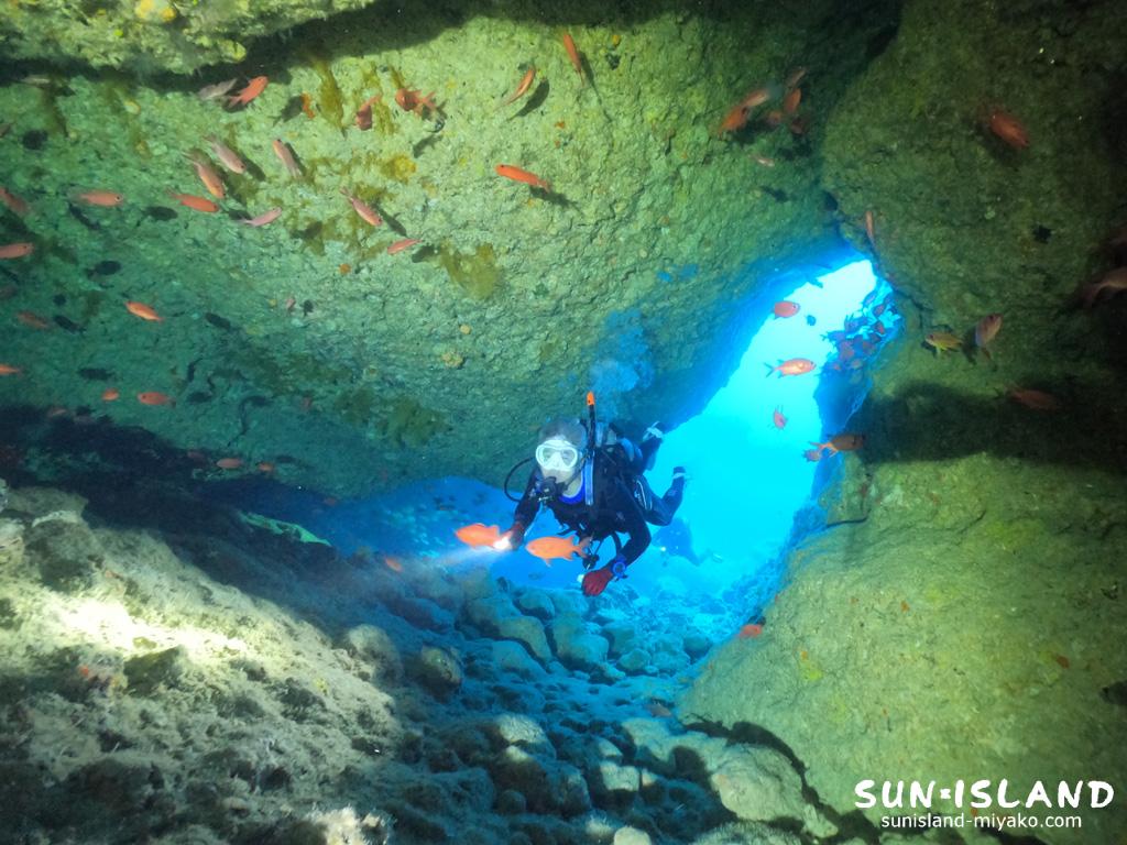 全長20mほどの洞窟探検。水中ライトをあてると、アカマツカサ・ミナミハタンポ・リュウキュウハタンポが逃げ惑う。カノコイセエビも数多くみられ、皆さん真っ暗な世界をお楽しみなられてました。