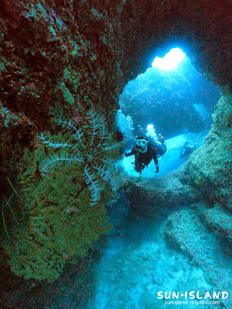 壁面に映えるイソバナを3つの穴が織りなす造形をどう見るのかにより印象がガラッとことなる不思議な穴の造形を楽しめるんです。視野を広くしっかり周りを見渡すこと、宮古島の地形ダイビングではとても重要です。オススメの場所や見方は、潜水前の説明でお知らせ致します。ぜひご自身の目でじっくりご覧ください!では、また。