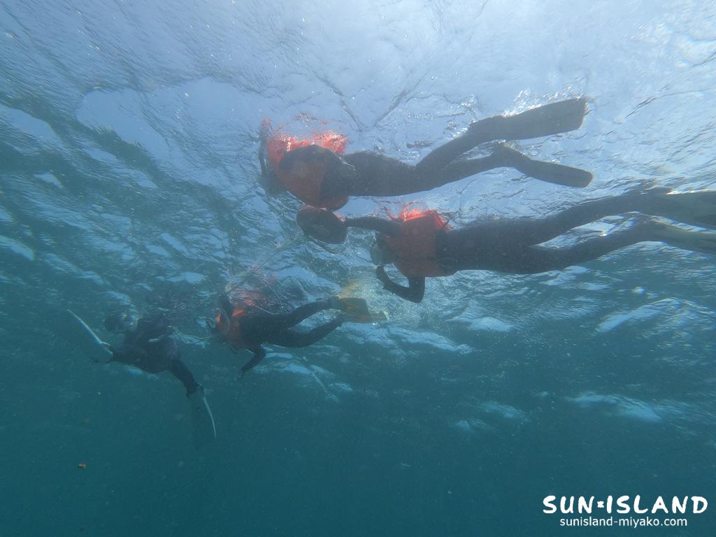 ポイント到着後、体験ダイビングの皆さんは、軽器材装着し早速スノーケリングツアーへ。