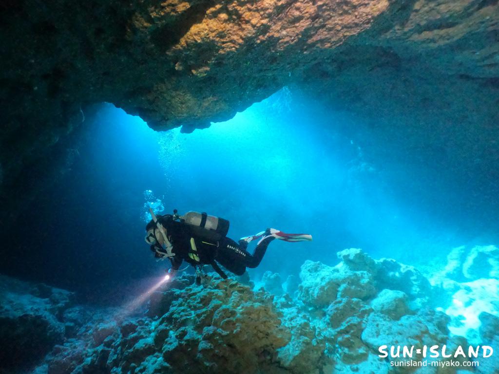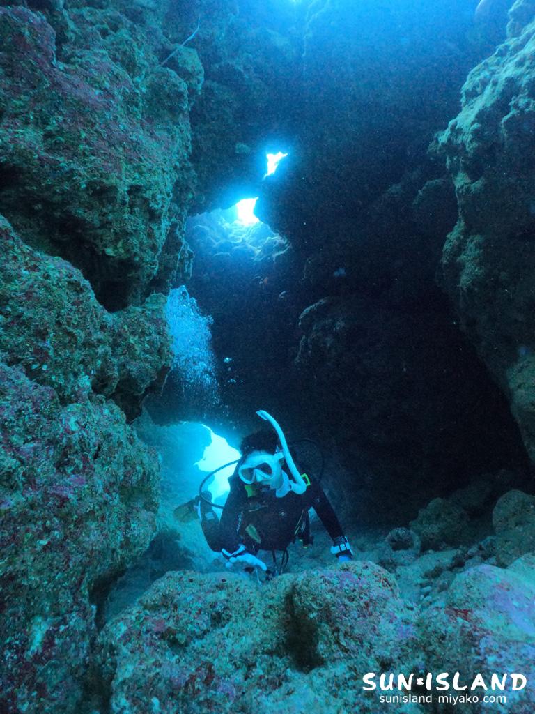 メインスポットの縦穴からの景色、光が放射状に差し込み陰影が素晴らしい。皆さんが思う『宮古島ダイビング』のイメージする造形だね。