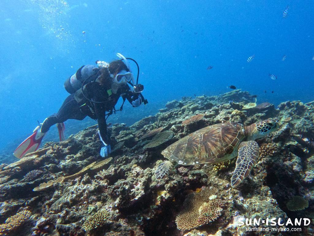 スノーケリングツアーの際に、なんとウミガメに遭遇したとか!夏の宮古島でのいい想い出になりましたね。ボート体験ダイビングは12歳以上60歳までの健康な方であればご参加いただけます。