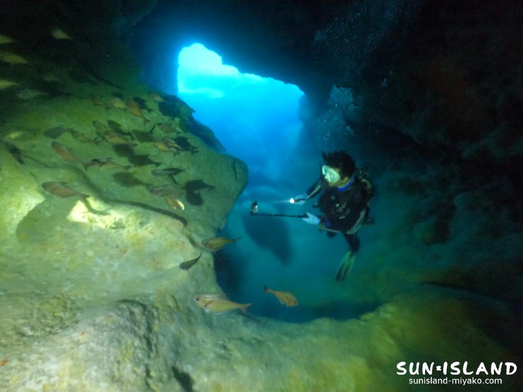 ギラギラ太陽から放たれるレーザービームのような光は薄暗い洞窟内を切り裂くほど穴の水底20mまで到達する。この陰影がホント素晴らしくって『これぞ地形ダイビングの醍醐味だー!』と、叫びたくなる衝動にかられる(爆