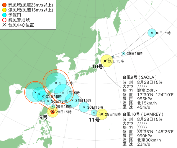 上記台風進路図をご覧いただきますと、日本列島周辺に台風9・10・11号の3つ発生してます。このなかで、沖縄地方に影響があると思われるのが9号・10号の2つ。