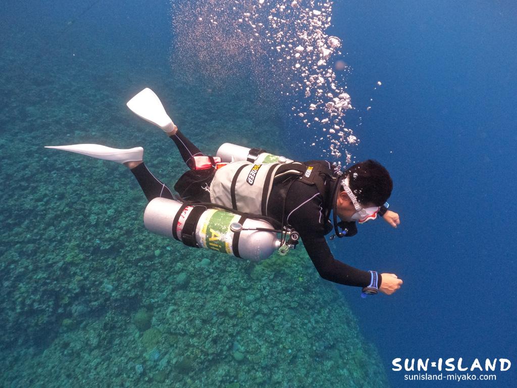 Kさんは、PADIオープンウォーターダイバーコースを当店で取得していただき、宮古島にお越しになられる際、伊良部島・下島島周辺の起伏に富むダイナミックな穴や造形がメインのダイビングをシングルバックマウントをはじめ両脇にシリンダーを配置するサイドマウントなど、スタイルを変え宮古島ダイビングを楽しんでいらっしゃいます。