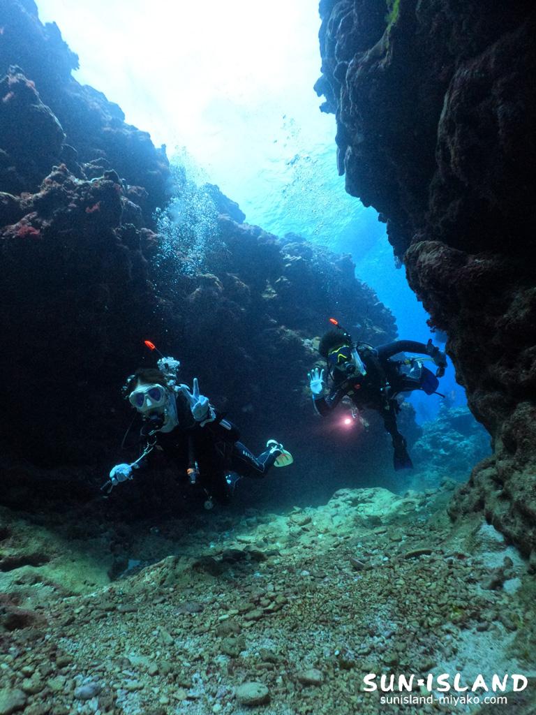 宮古島ダイビングといったらやはり『地形』は外せないません。1本目はチェックダイブを兼ねて、棚を切り裂くクレパス内を探検する『白鳥チャネル』からスタート。