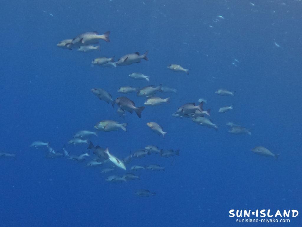 リーフエッジ沿いに根付くアサドスズメダイ・ロクセンスズメダイ・オキナワスズメダイをはじめ、ハナゴイ・ウメイロモドキ等、鮮やかな魚たちに目を惹かれますが、その奥にいるのはバラフエダイ・ヨコシマクロダイの群れ。