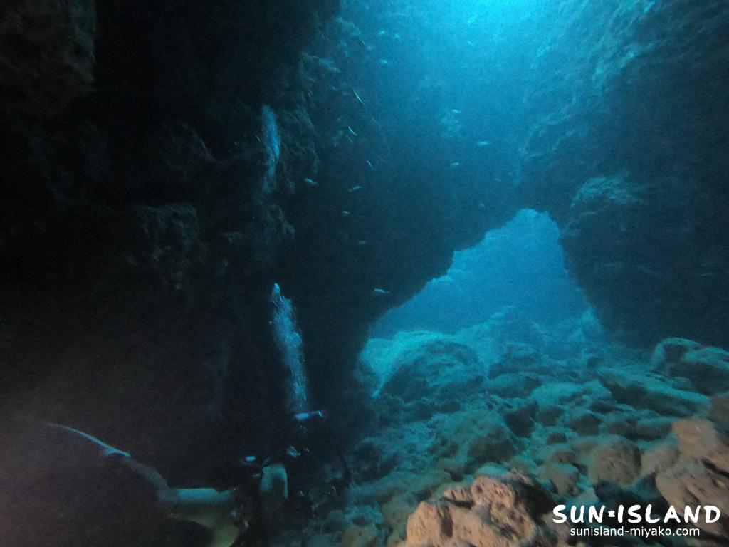 ここは大人気のポイントですが、水深が26mとやや深いです。ダイブタイムの半分以上は洞窟の中ですので、ガス管理もご自身でしっかり行わなければなりませんよ。
