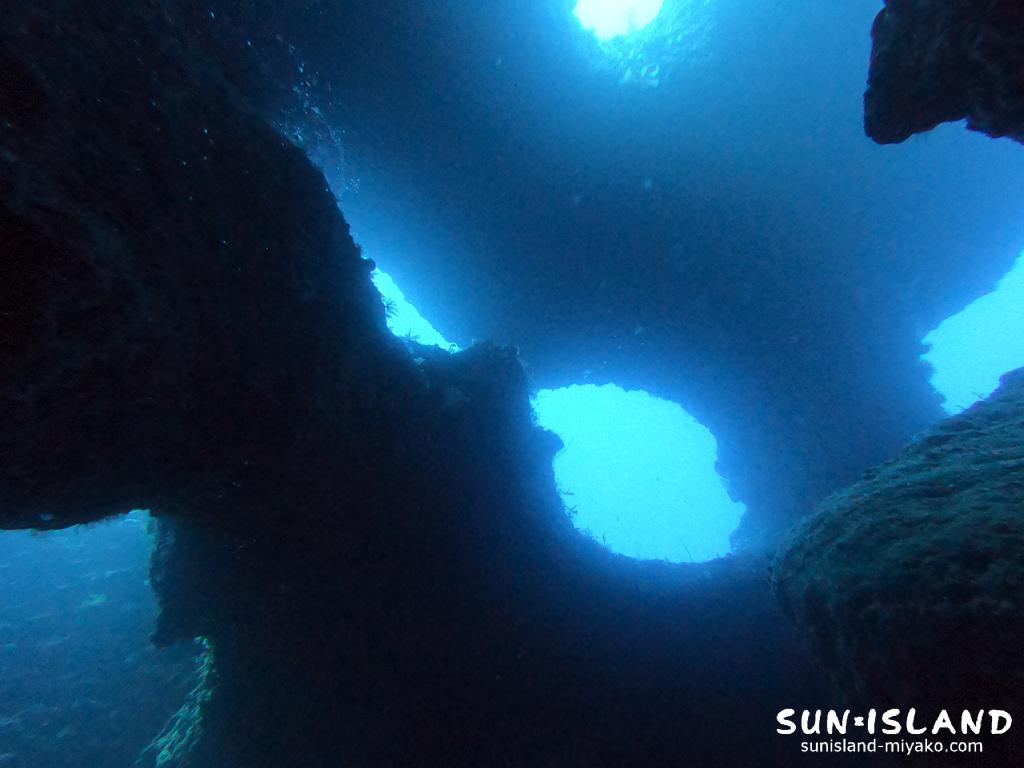 水深が30mを超える深いポイントで、魚影はあまり多くないです。ですが、中側から周りにいくつか空いている穴を見上げると、海の青さが一層に際立ちます。