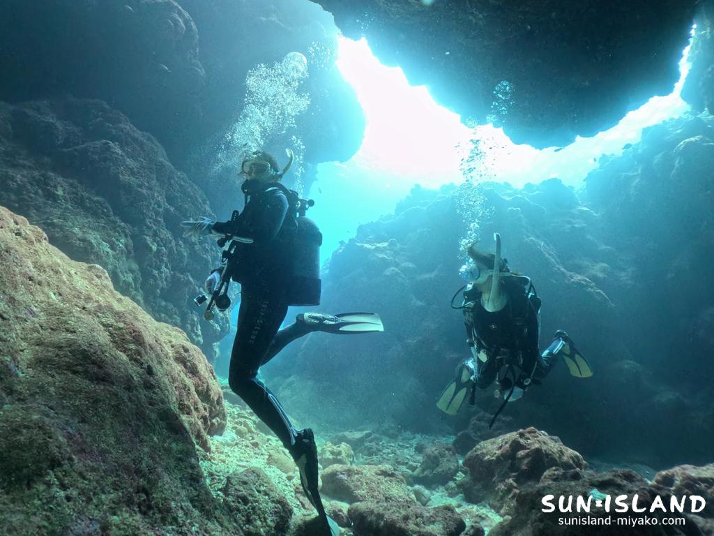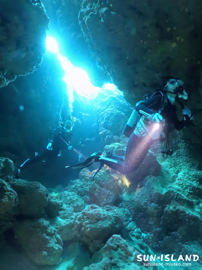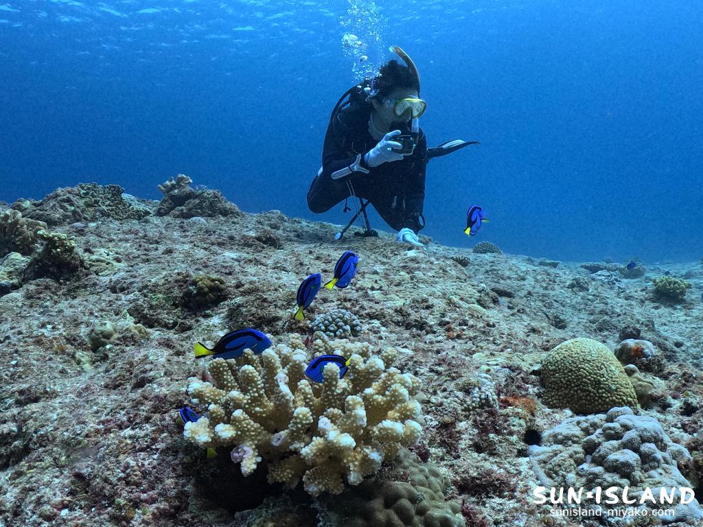 潜る前までは期待や不安・緊張で呼吸も早く戸惑うところもありましたが、時間をかけゆっくり水慣れをしたのち水中世界へゆくと、手を伸ばせば届きそうな距離に彩りに富んだ様々な形をした魚を見たり、水中移動する際、浮力調整器具(BCD)の操作を行い、中性浮力をキープすることで空を飛んでるかのような開放的な浮遊感や宮古島ダイビングの特徴的な自然が作り出したダイナミックな造形などを前に、Yさん・Wさん、呼吸もやや早く興奮気味でしたが、全てのダイビングお楽しみいただきました。