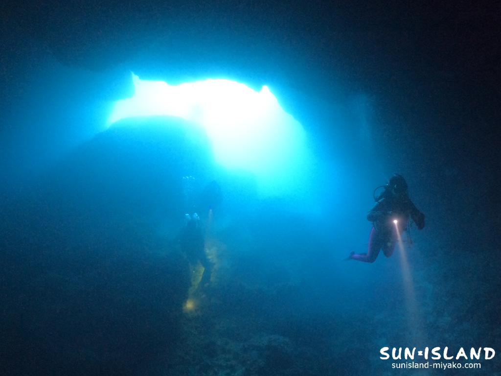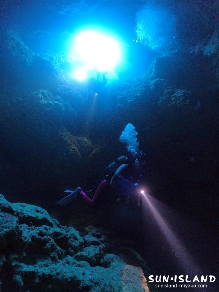 真っ暗な洞窟内をライトの灯りを頼りに潜降するなんて、地形ダイビングが特徴でもある宮古島ダイビングならではの体験ですね。