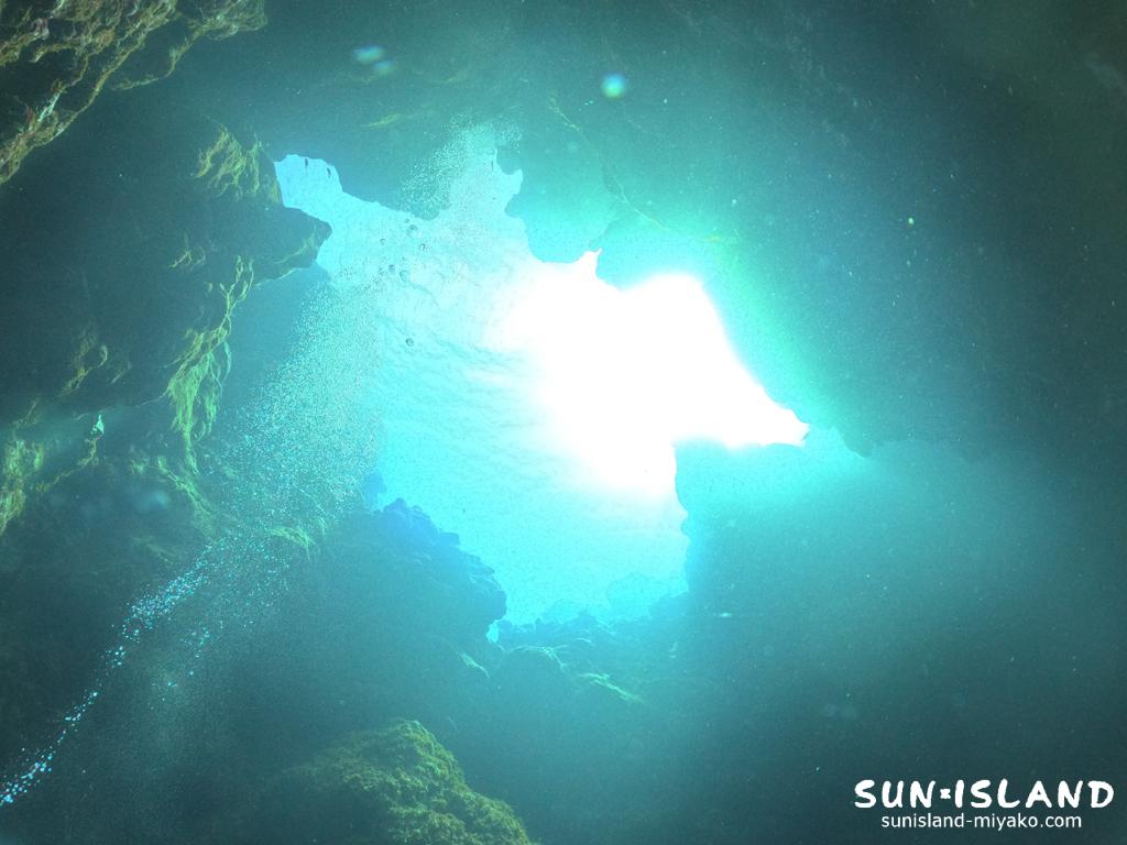 陽射しの角度的に1ダイブ目に潜ると、穴に太陽がタイミングよく重なり、明暗のコントラストが美しいんだ。