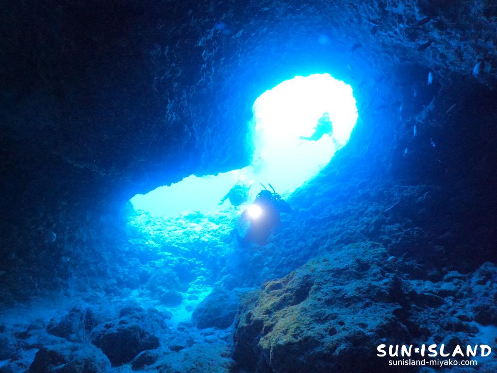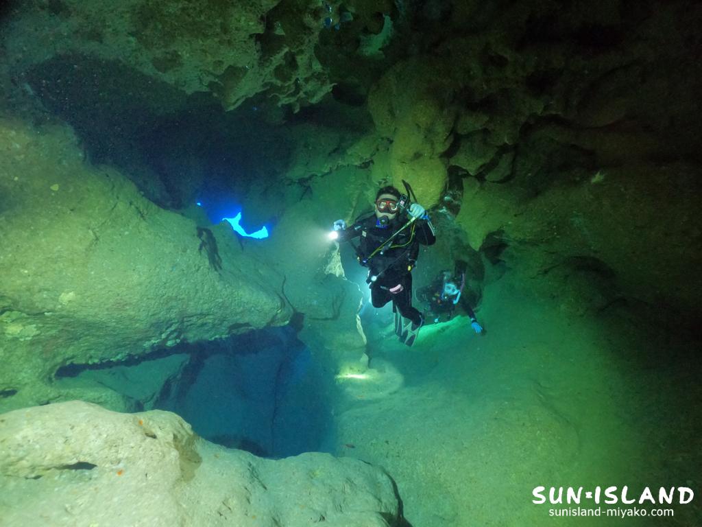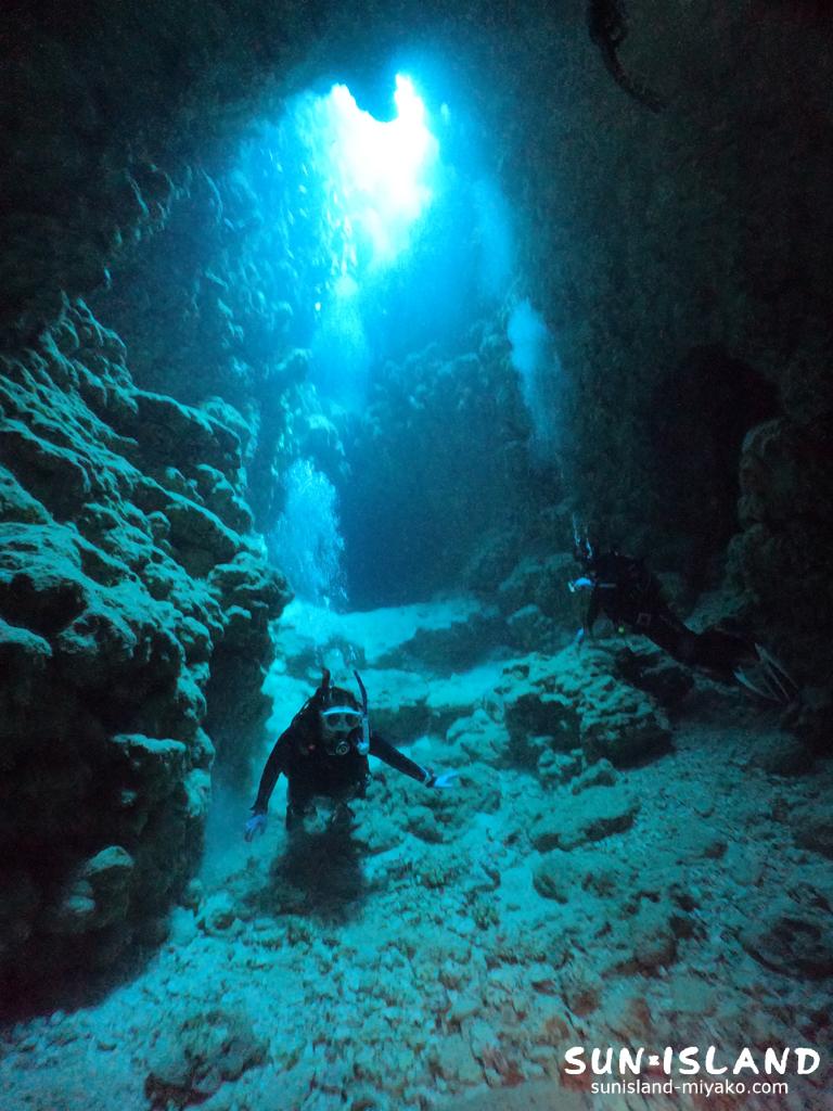 棚の側面からL型の洞窟を介し、陸上にある水面に通り抜けができる宮古島ダイビングならではの体験をすることができますよ。