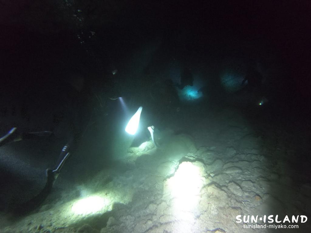 『 ワープホール』は全長約20mほどの真っ暗な洞窟で水中ライトを頼りに進んで行く探検感が最高のポイントです。洞窟内にはアカマツカサやハタンポなどがたくさんいて水中ライトに照らされて逃げる姿が可愛らしいですね。