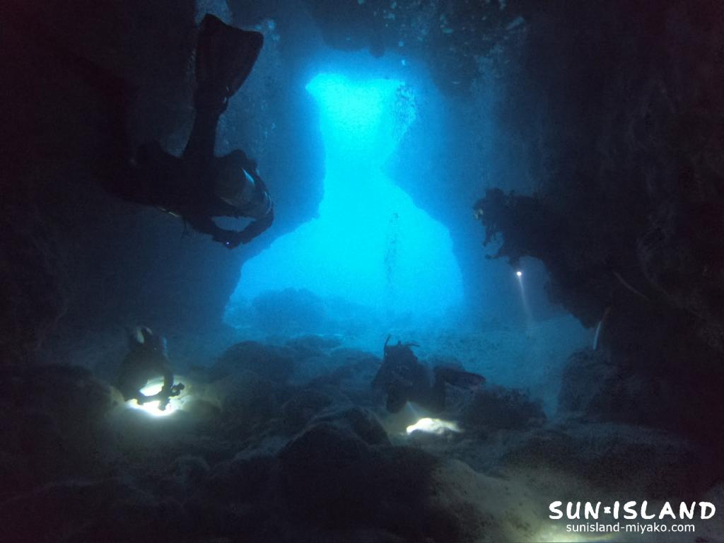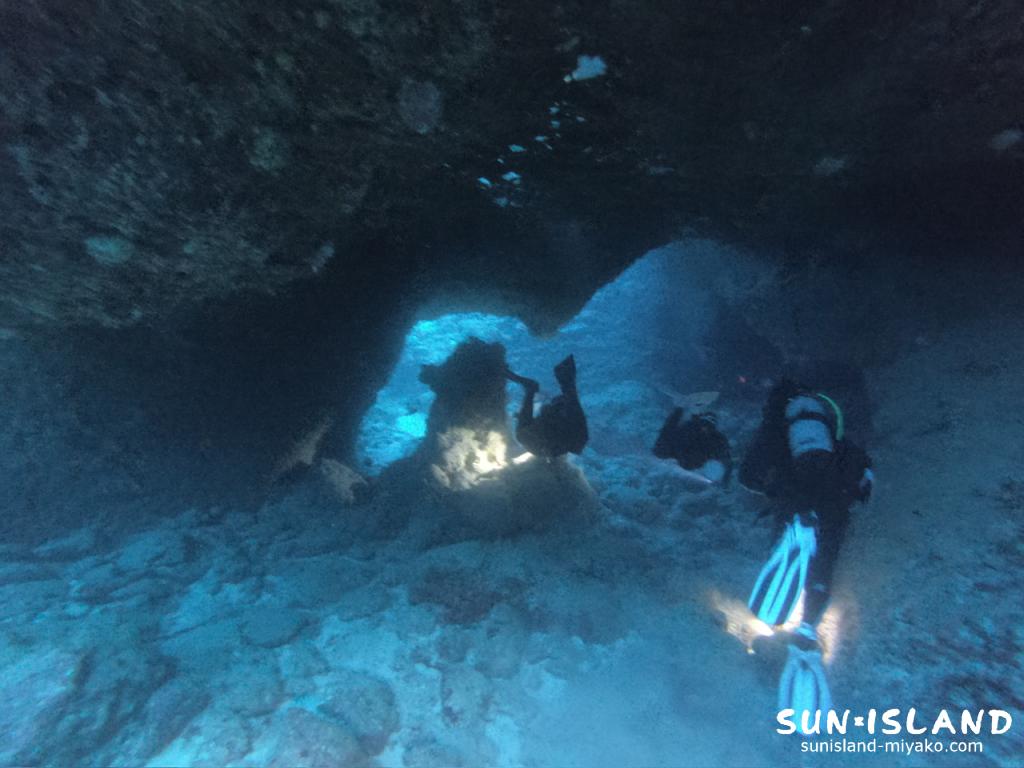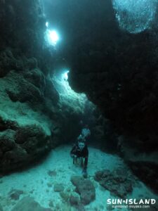 水深3m程の棚の上からタテとヨコにL字に通り抜けられる洞窟になっていて、真っ暗な縦穴を水中ライトを頼りに潜降していきます。