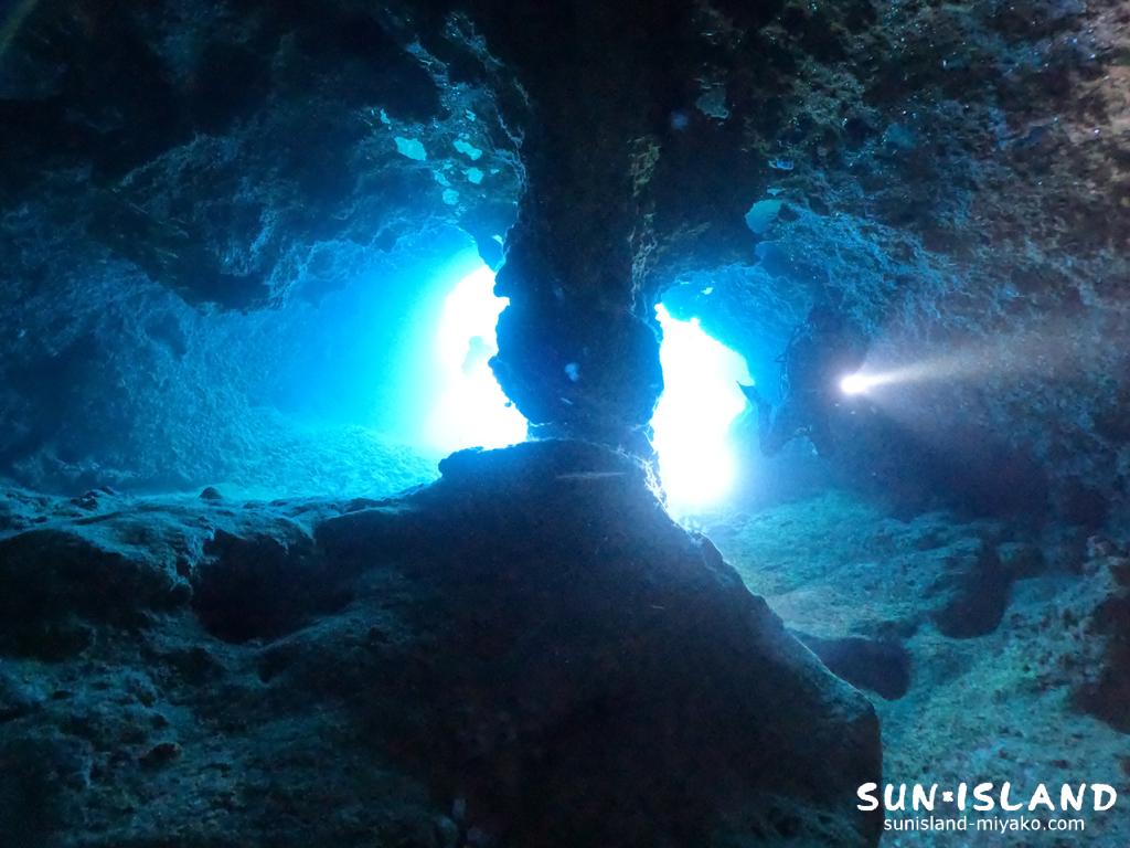 洞窟の出入口から浮上する縦穴までは暗めなので水中ライトを照らしながら進みます。探検気分もしっかりと味わえますよ。