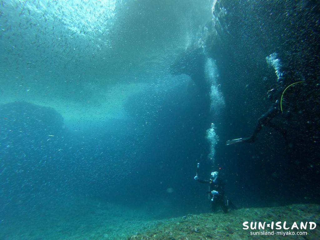 写真を見ていただくとおわかりいただけると思いますが、時期によっては洞窟の出入口付近で大量のキビナゴが辺り一面に泳いでいるのを見ることができます!