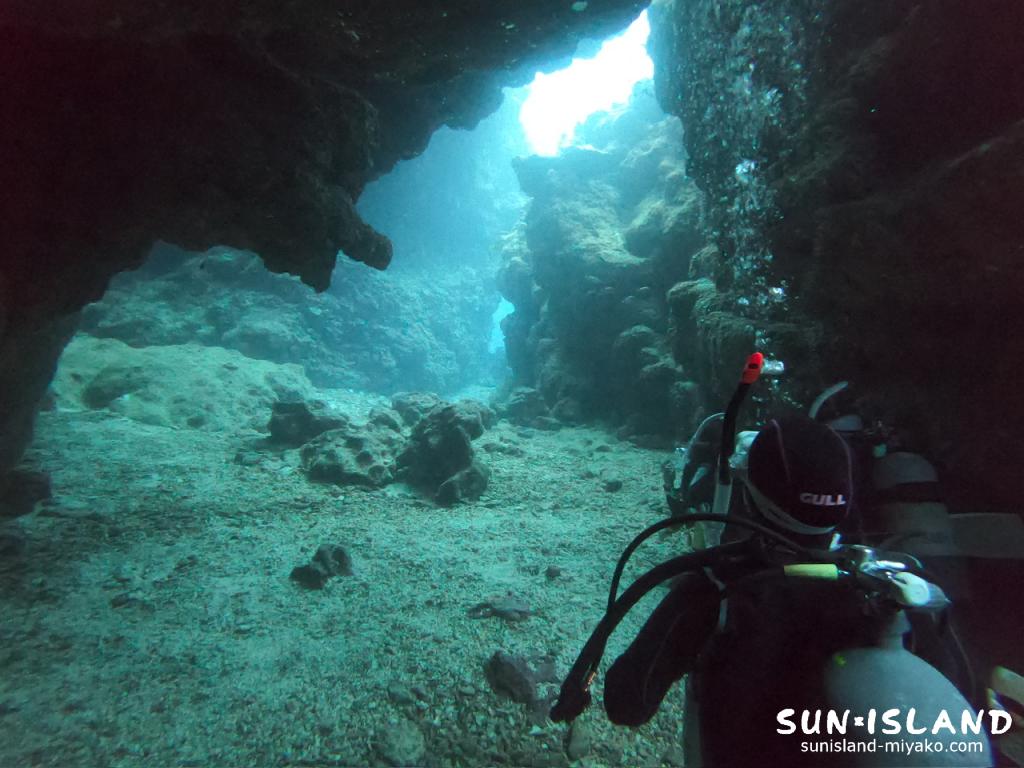 最大水深は約14mほどと浅い所にある洞窟で、中も真っ暗ではなく所々にある裂け目から綺麗な光の差し込むポイントです。