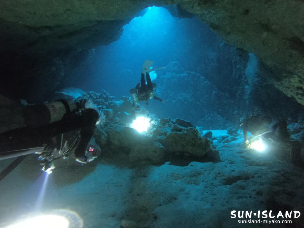 今日はとてもうねりが強かったため、浮上はせずに出入口付近で 他の洞窟内でみるハタンポとはまた違う少し大きい種類のハタンポたちを見たり、出入口から見える海の青みを楽しみました。