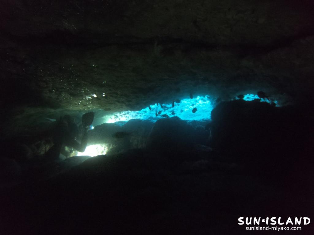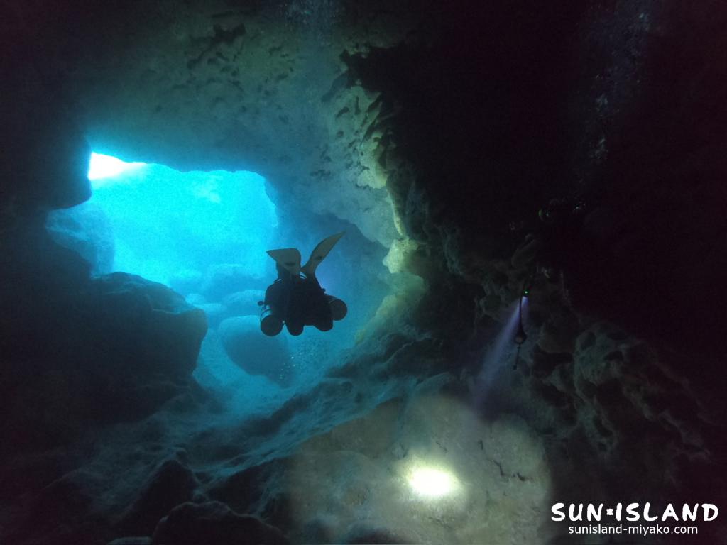 地形ダイビングの見どころの1つ『洞窟の出入口の海の青み』 – 宮古島ダイビングショップ サンアイランド|エンリッチドエア(ナイトロックス)標準装備の地形プロガイド
