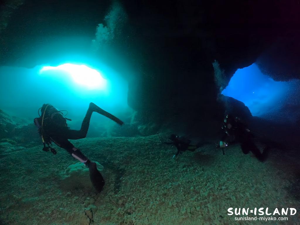 移動中の白濁したやや緑がかった水の色が、くっきり青色で特徴的な穴の造形をキレイに演出させており、水底から見上げた造形は、視野より広い画角150度前後に5つの不規則な穴が見られ、壮大且つ幻想的な幾つかの穴が織りなす造形を前に皆さん興奮気味でした。