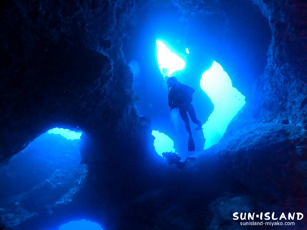 宮古島ダイビングの特徴は、水底の形状が起伏に富み、洞窟をはじめ幅広い空間に幾つか穴があく『ホール』やクレパス・ドロップオフなど様々な造形が各ダイビングスポット・ポイントで見られること。