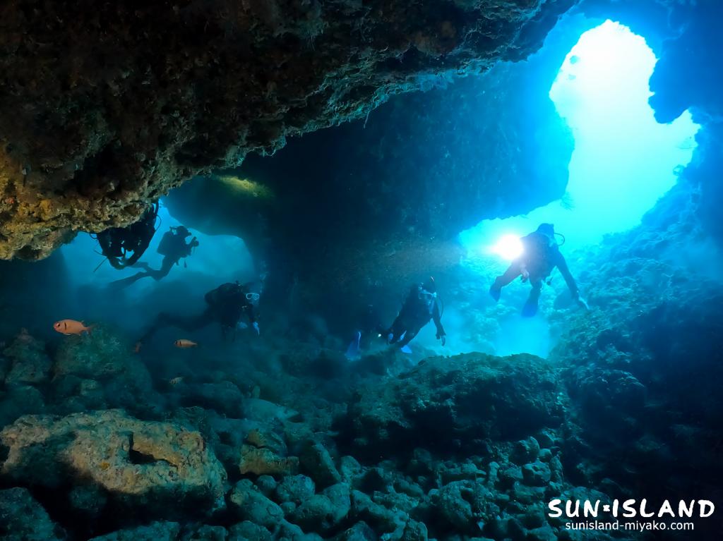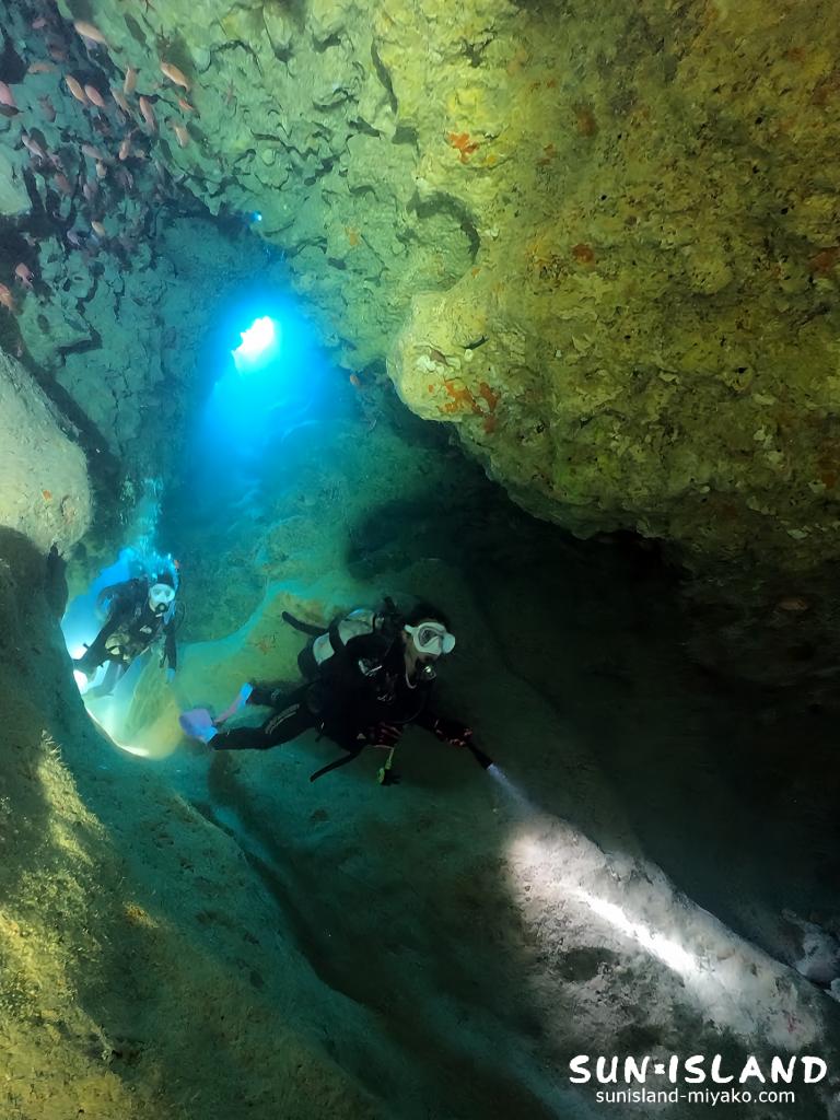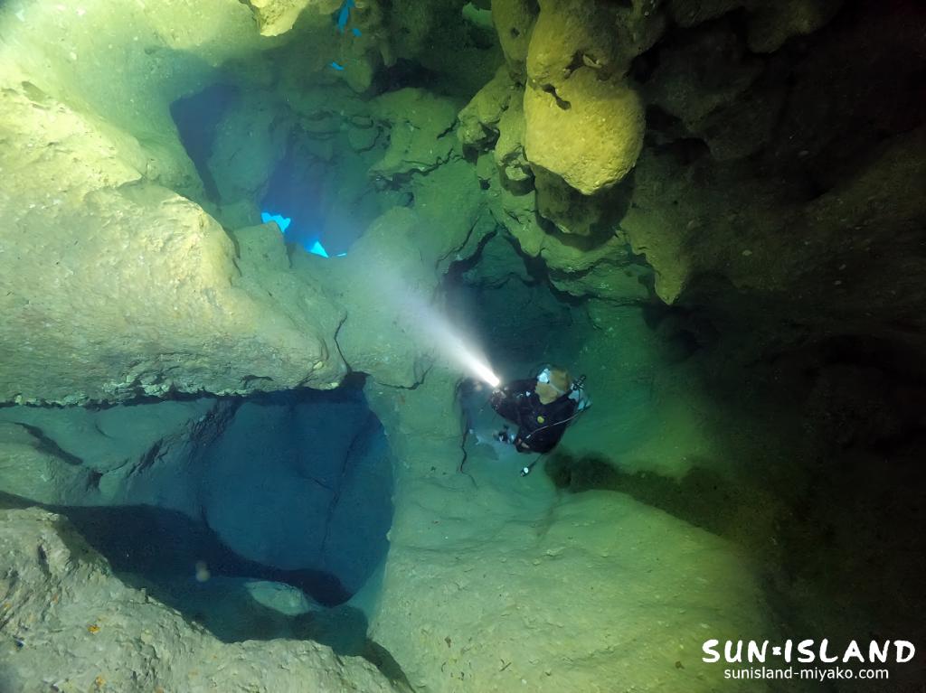 起伏に富む素晴らしい穴の造形が宮古島ダイビングでしか見ることができない唯一無二の景色