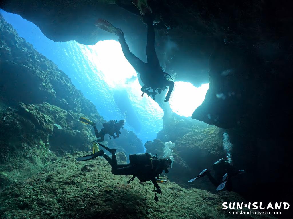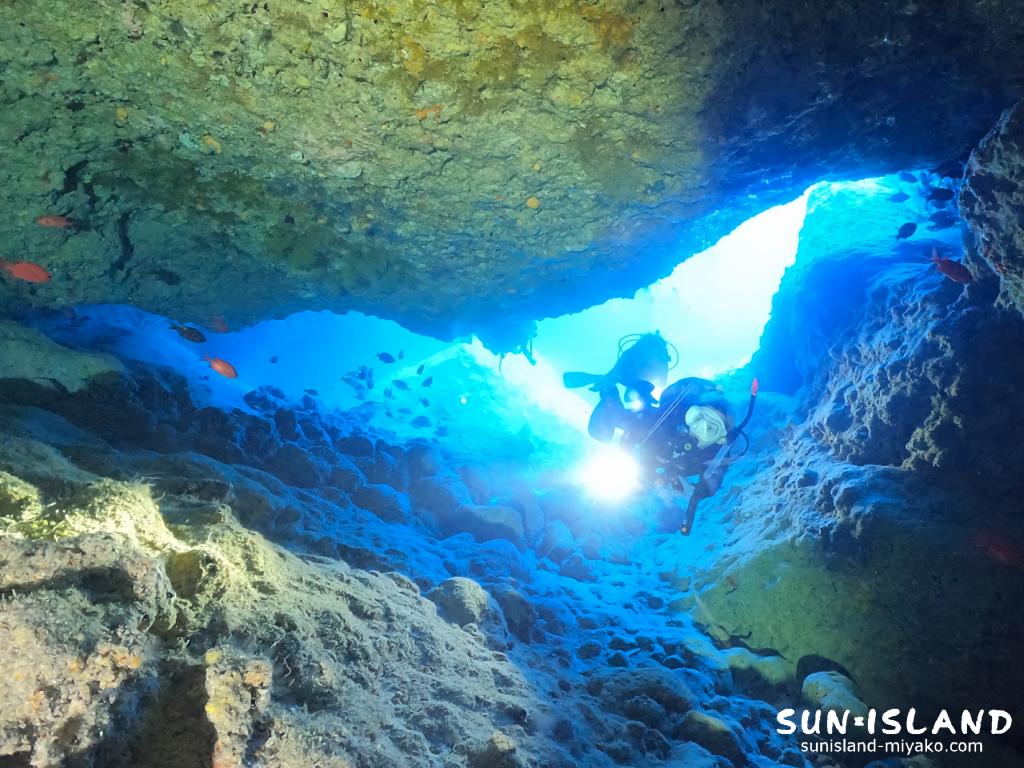 最大水深28m且つ手狭で長い洞窟は探検気分を味わうことができ『地形の宮古島ダイビング』を丸ごと体験できる。