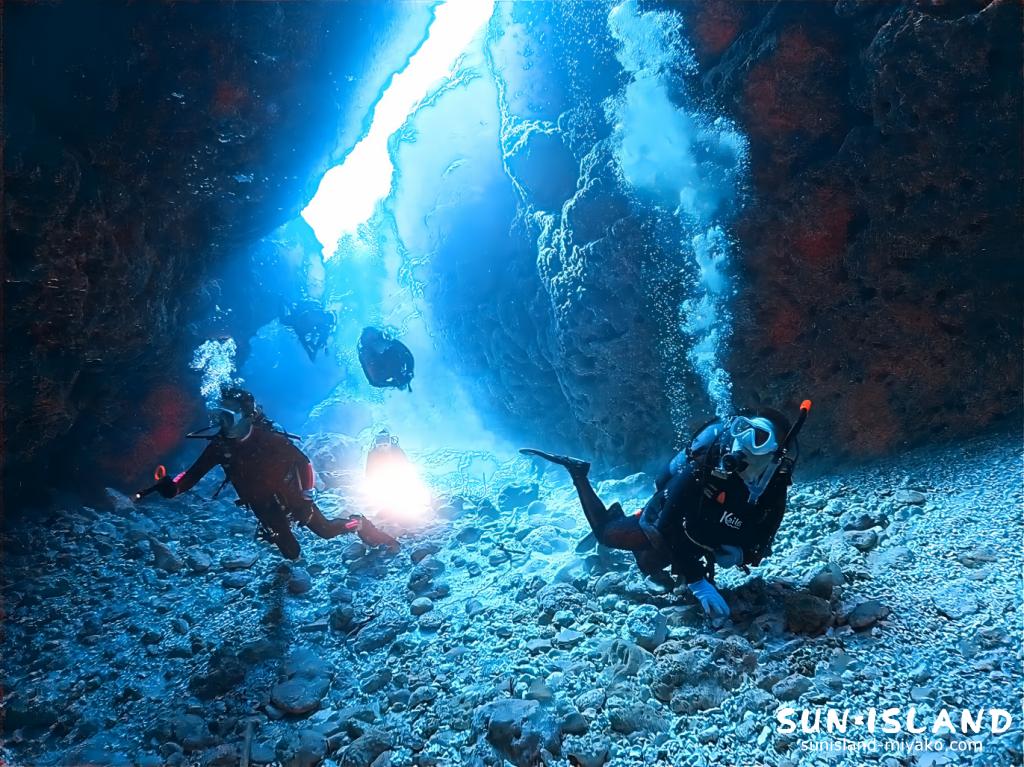 真っ暗な洞窟内を進むこちらのダイビングスポット・ポイントは、水中ライトは必須で、こんな探検気分を存分に味わえるのも宮古島ダイビングならでは。