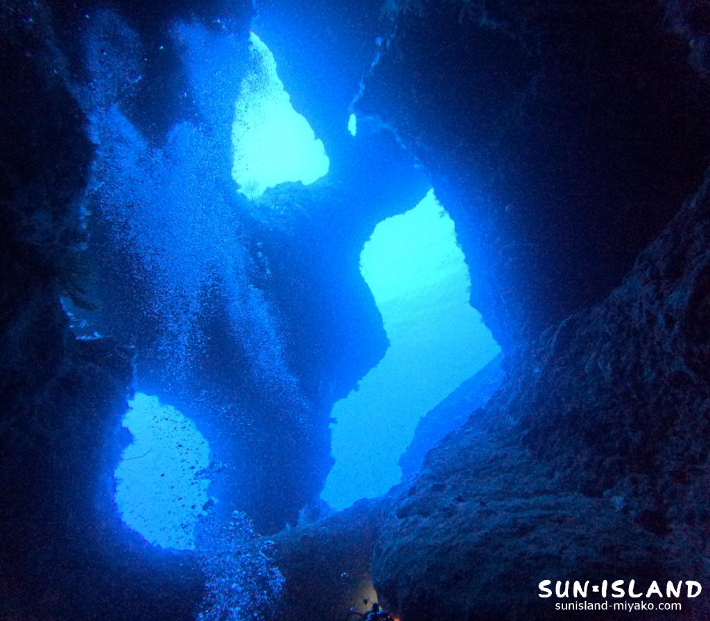 宮古島の三大地形ポイントの内のひとつで、ホールと呼ばれる大きな空間にいくつか穴が空いていて、その穴を介してホール内を出入りすることができるようになっています。