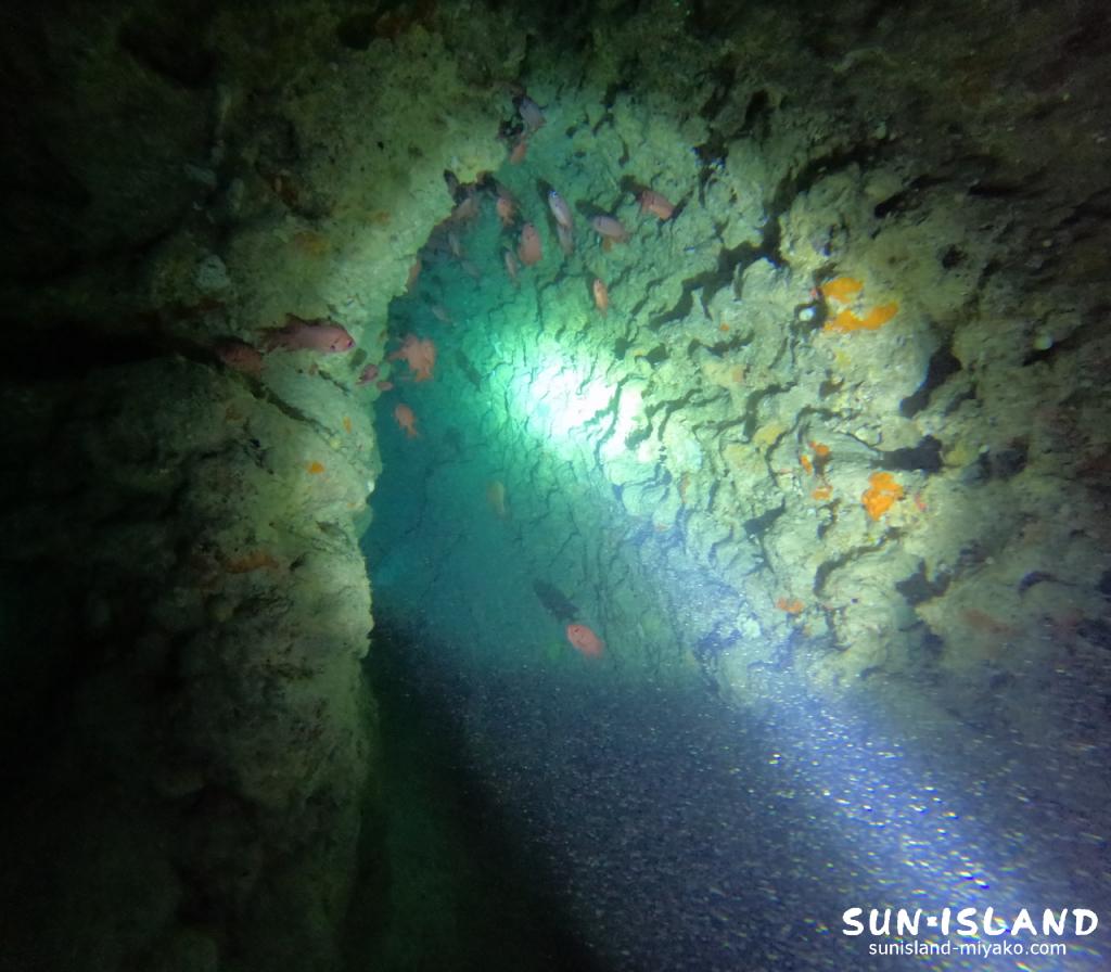 洞窟内は所々頭上に裂け目があり、光の差し込みがあったり、暗いところには夜行性のアカマツカサや、ハタンポなどの魚がたくさん見られたりと見ごたえ抜群です。