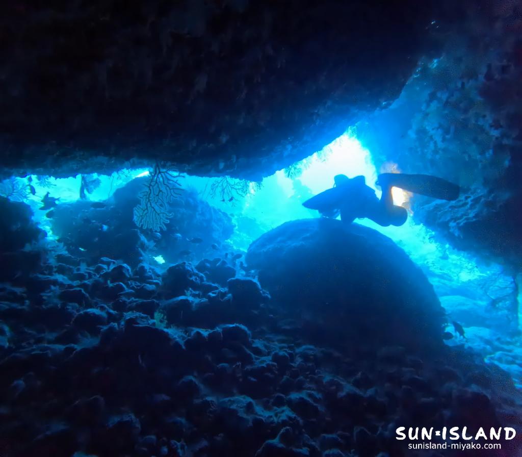 真っ暗な洞窟を水中ライトを照らしながら進む時のわくわく感と真っ暗なぶん出入口の海の青みが引き立てられとても綺麗な景観に見惚れてしまいます。