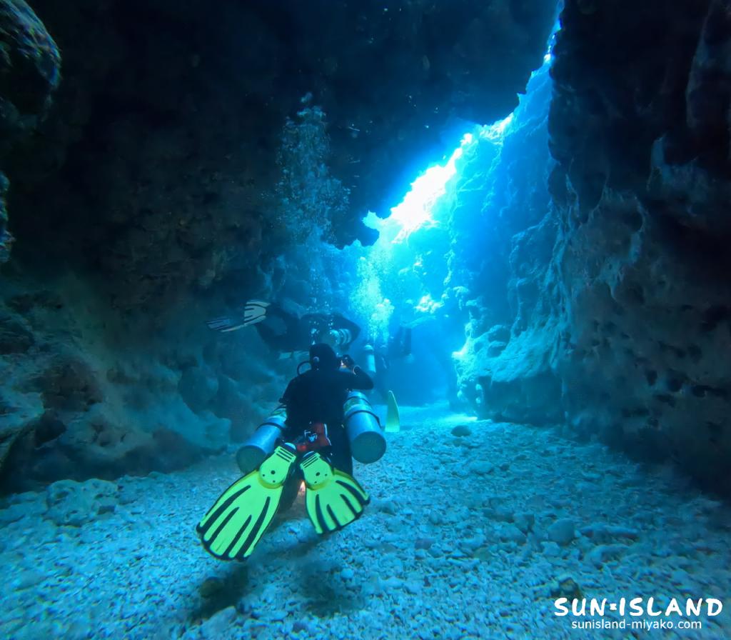 洞窟内は少し手狭になっていますが最大水深が洞窟の出入口で14mとそこまで深くないので、あまり経験がない方でも地形ダイビングを楽しめるスポットとなっていますよ☺️