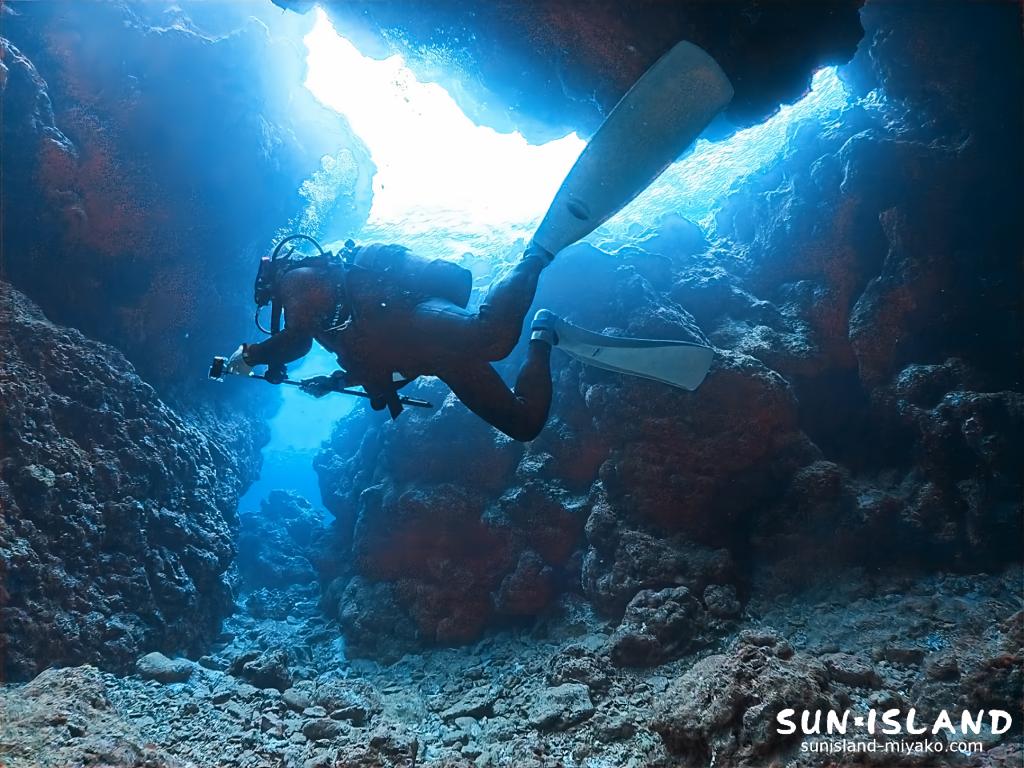 側面の穴から洞窟へ侵入すると広大な幅20mほどの真っ暗な空間が広がり、水中ライトの明かりを頼りに探検気分を味いながら進んでゆくと縦穴に遭遇。