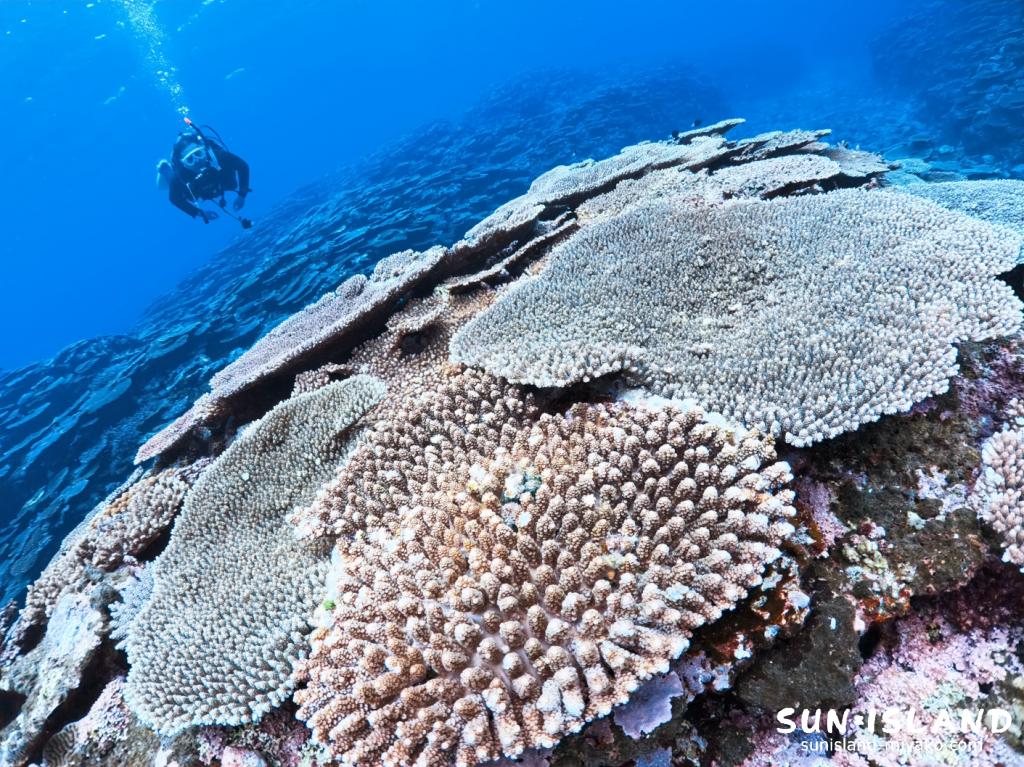 テーブルサンゴや枝サンゴ、ウミキノコなど、様々な種類のサンゴが群生しており、その間を色鮮やかな熱帯魚たちが泳ぎ回る姿は、まさに竜宮城。