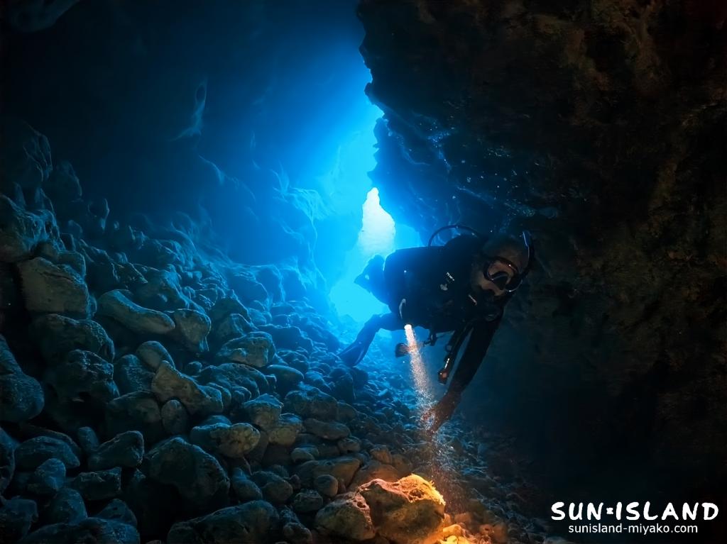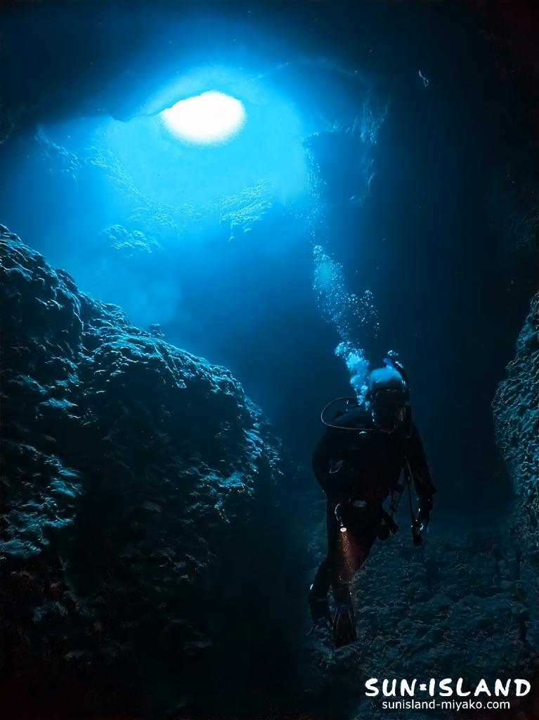 宮古島の地形ダイビングは、複雑に入り組んだ地形と、そこに差し込む光が織りなす幻想的な風景が本当に魅力的。