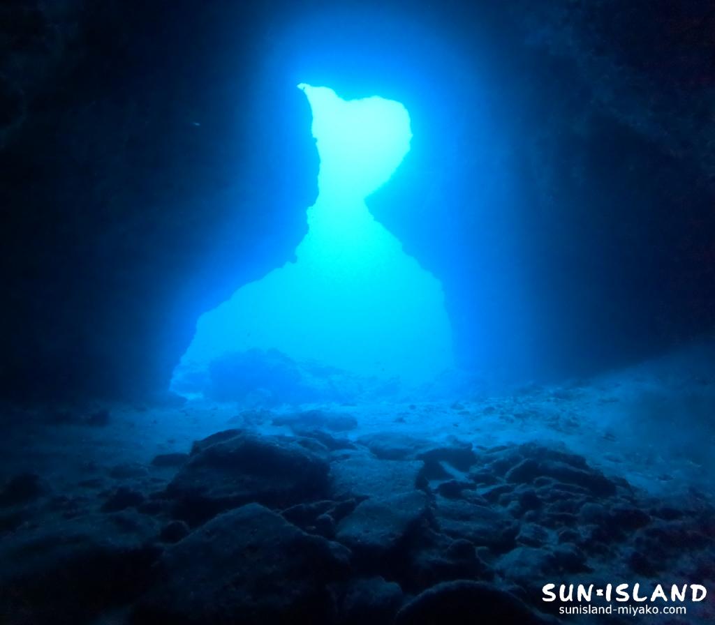 洞窟は役15m程で細長く、真っ暗で水中ライトを頼りに進んで行くワクワク感と2本の洞窟にある系4つの出入り口から見える海の青みのとっても綺麗な景色がポイントの見どころです。