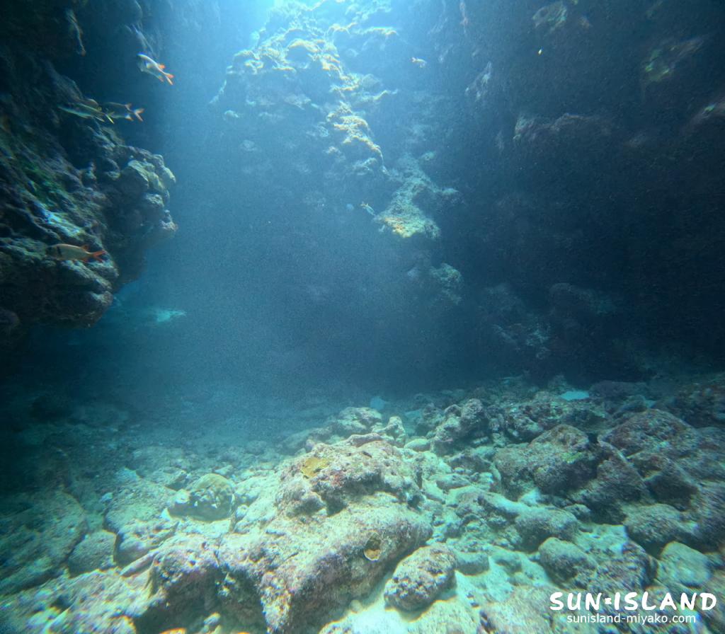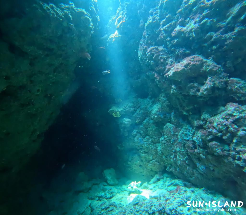 1歩手前から折り返し地点を見上げた時の光の差し込み、穴の造形、泳ぐ魚全てがベストマッチで最高の景色を見ることができます。