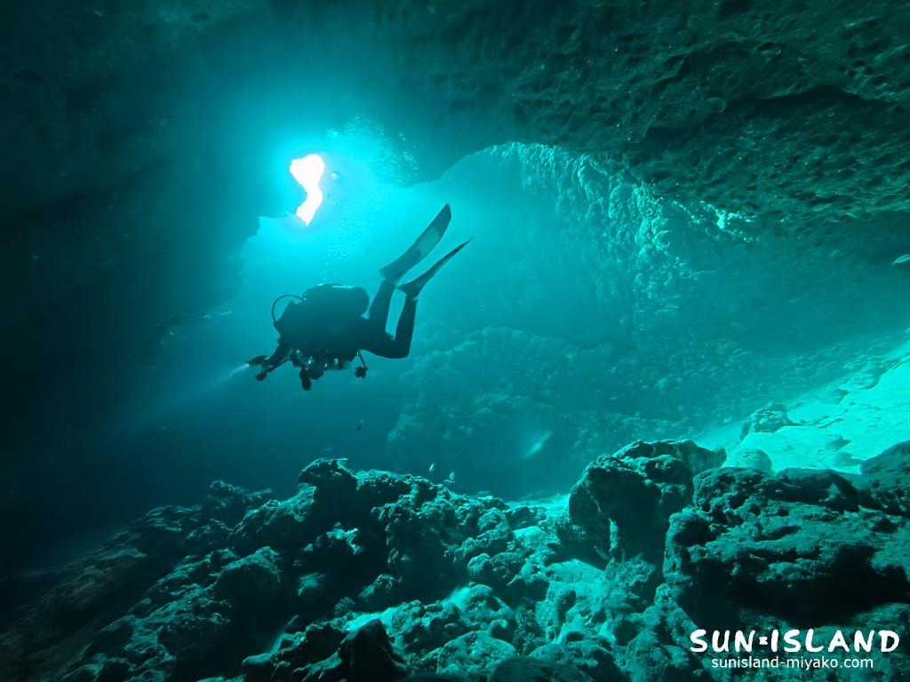 伊良部島は初心者さんでも楽しめる短めのホールやアーチが多い一方、下地島はドロップオフや複雑な洞窟が多く、上級者さん向けのポイントがたくさんあります。