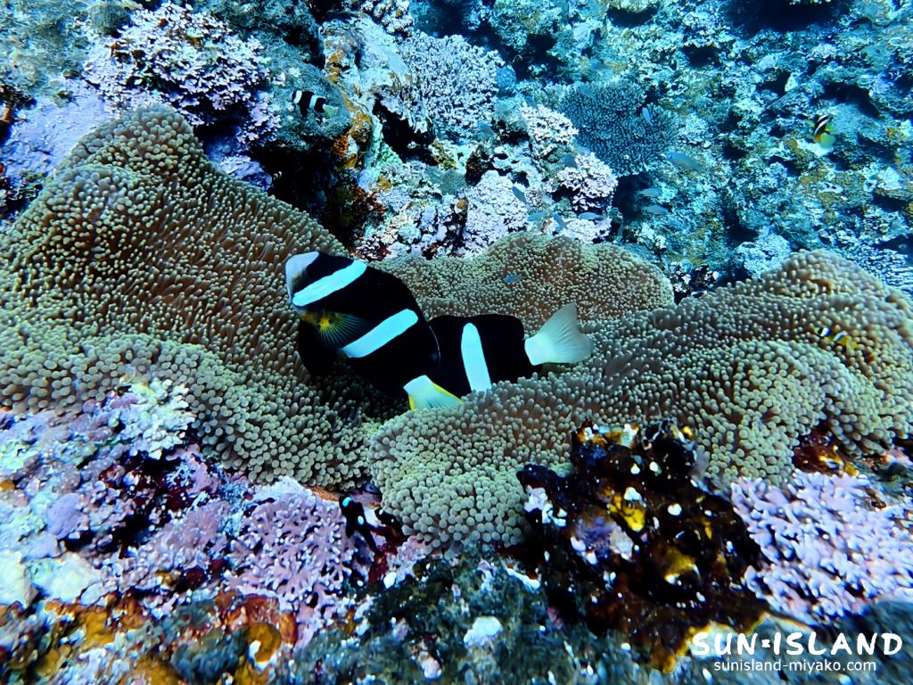 沖縄で見られるクマノミは、通常茶系が多いのですが、このポイントでは、まるで墨で塗ったかのような真っ黒な個体を見ることができます。